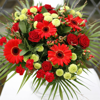 This bouquet is a beautiful arrangement filled with only the finest Christmas Roses, Germinis and Carnations.A true traditional bouquet perfect for sending to family, friends and loved one to warm their home this Christmas season.