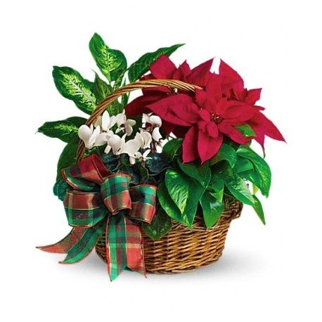 A gorgeous basket bursting with festive favourites. Our usual basket for extra winter wonder, it features a red poinsettia, a red rose, a white cyclamen and a variegated ivy.