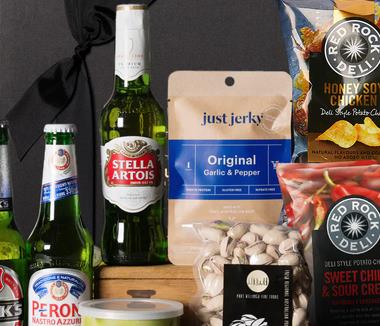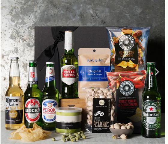 Beers Hamper. After all, what man can resist beer. Heineken Lager Bottle,Becks, Corona Extra Beer Bottle,Peroni,Snack Pistachios, Original Beef Jerky, Chilli Chips