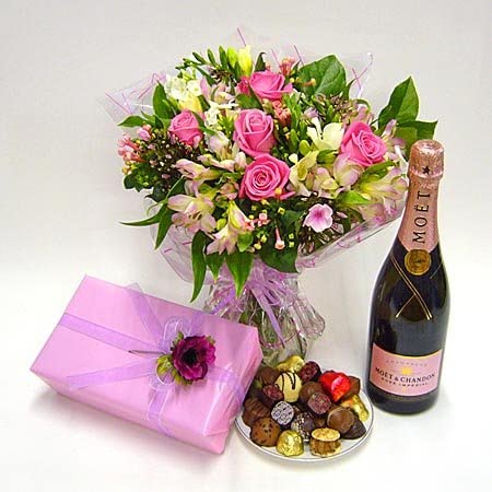 Handtied Champagne and Chocolates.A beautiful Hand Tied bouquet hand made by our florist to include Champagne and Chocolates.this makes a perfect gift for family or friends who enjoy the good things in life. Send Someone You Love the Beautiful Gift of Fresh Flowers Delivered Right to Their Door.