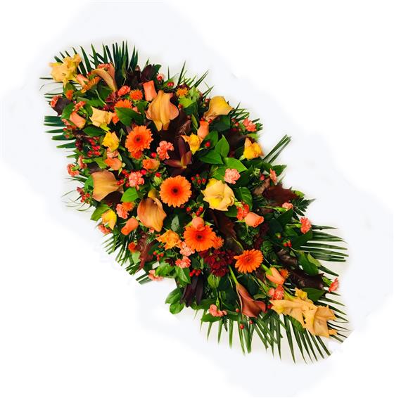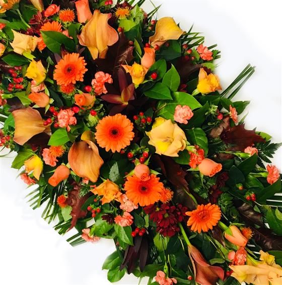 This double ended oasis spray is a popular funeral tribute arrangment in vibrant orange coloured flowers,artistic design by our in house florists.