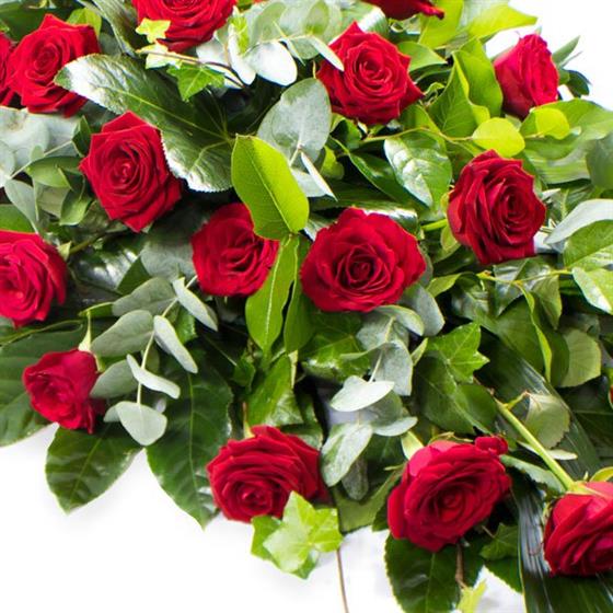 This double ended oasis spray is a classic funeral tribute arrangment in all red roses, artistic design by our in house florists.