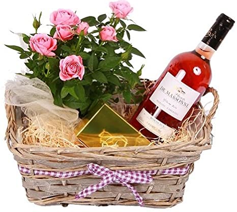 Rustic Rose & Rose Wine Basket. A perfect combination Gift basket of a mini Rose Wine Roses and Belgium chocolates makes any occasion extra special.
