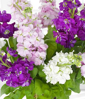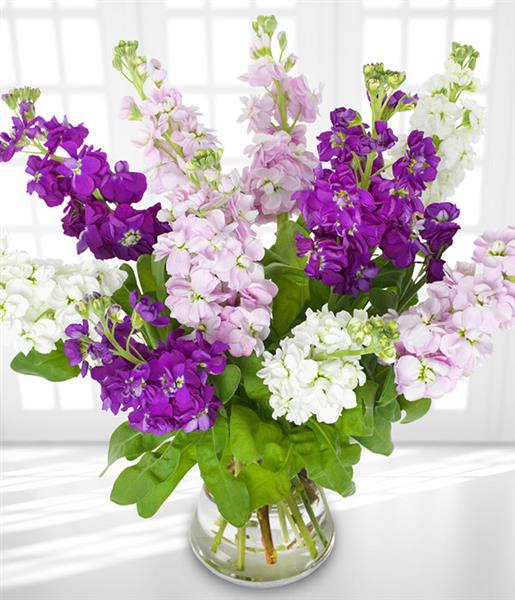 Enjoy the summer evenings with this delightfully scented bouquet of mixed pink white and purple stocks.Vase not included.