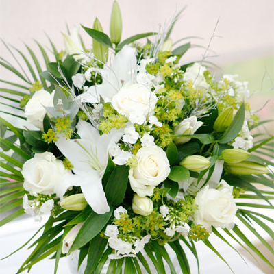 The Orient is a classic white arrangement full of fragrant white oriental lilies, white roses complemented perfectly by the freshest seasonal foliage.