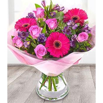 This pretty in pinks and purple bouquet contains a mix of cerise gerberas and roses, complemented by purple flowers.